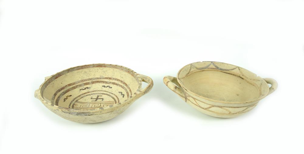 Due coppe una con orlo appiattito e vasca poco profonda, fondo piatto, decorata a motivi geometrici, svastiche e fasce, anse impostate orizzontalmente sull'orlo; l'altra con orlo svasato arrotondato e vasca troncoconica, fondo piatto, anse a bastoncello impostate obliquamente sulla vasca, decorata ad archi di cerchio sulla tesa
