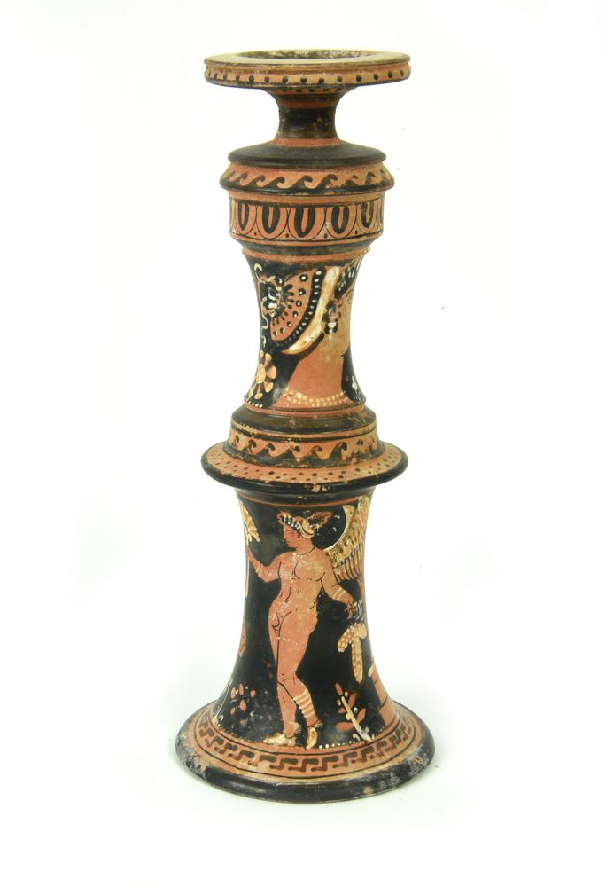 DECORAZIONE: elemento superiore decorato da due profili femminili affrontati con kekryphalos ricamato da cui fuoriesce un ciuffo di capelli, stephane radiata, orecchini pendenti e doppio filo di perle al collo. La scena è delimitata superiormente da un meandro ad onda destrorso ed un kyma ionico, inferiormente da un altro meandro ad onda destrorso. Nella parte inferiore dello stelo sono raffigurati un erote nudo gradiente a destra con kekryphalos, armille ai polsi ed alle caviglie che tiene flabello nella destra ed un grappolo d'uva nella sinistra; di fronte a lui una giovane donna con un chitone plissettato lungo fino a terra ed il mantello drappeggiato sul braccio sinistro, gradiente a sinistra con uno specchio nella sinistra ed una tenia nell'altra mano; fra i due un'ara col fuoco acceso; delimita la scena un meandro interrotto destrorso.