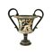 Orlo estroflesso, anse a nastro sormontanti, impostate verticalmente dall'orlo alla base della vasca con ponticello di raccordo, alto stelo di raccordo, piede troncoconico