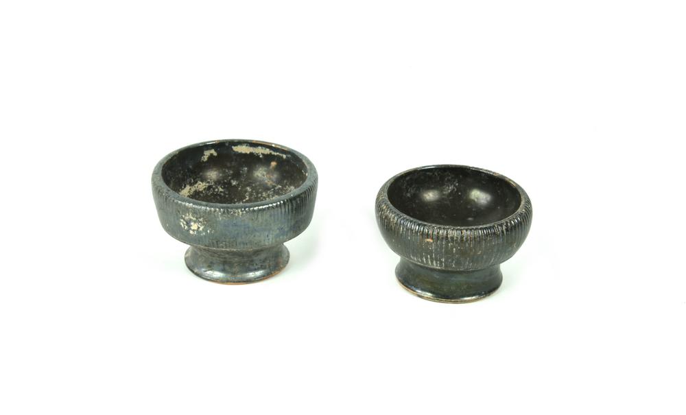 Due coppette con labbro leggermente rientrante, vasca poco profonda, piede ad anello, una con orlo baccellato.