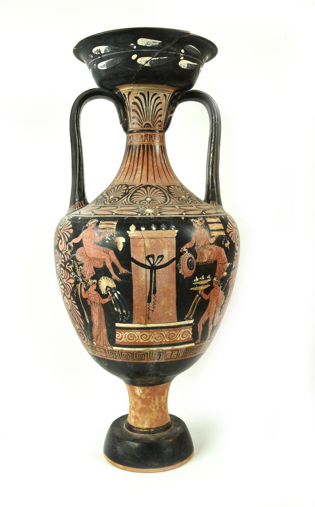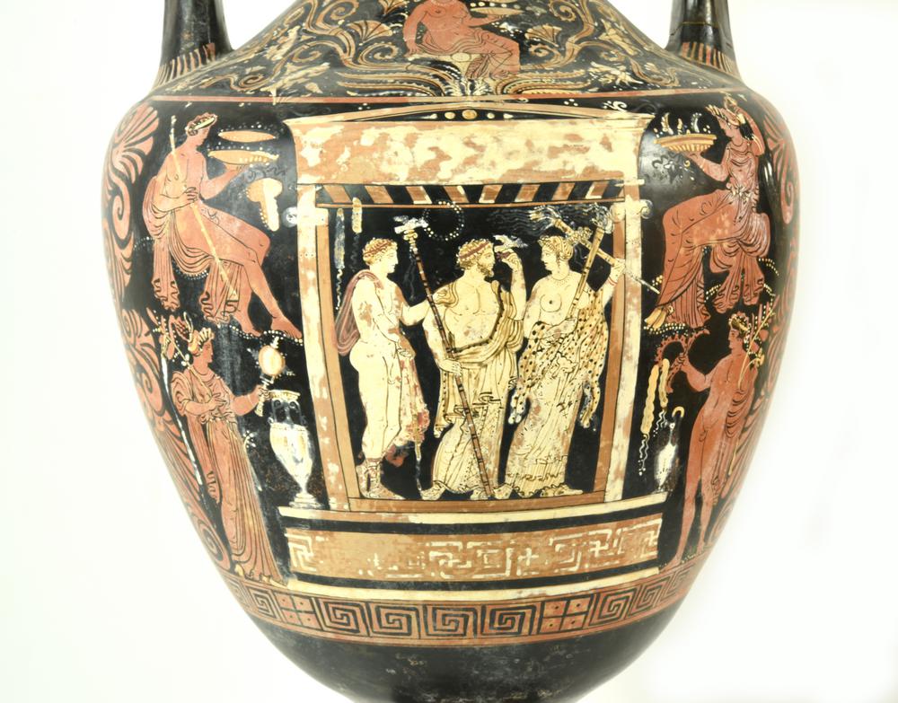 DECORAZIONE ACCESSORIA: risparmiate la parte inferiore allungata ed il fondo del piede; sul labbro tralcio d'olivo orizzontale sul collo palmetta aperta a ventaglio cui fa seguito un kyma ionico ed una falsa baccellatura, all'attacco delle anse trattini radiali, sotto le anse grande palmetta aperta a ventaglio fra coppie di girali ed infiorescenze; sotto alle scene figurate meandro sinistrorso interrotto da motivo a scacchiera