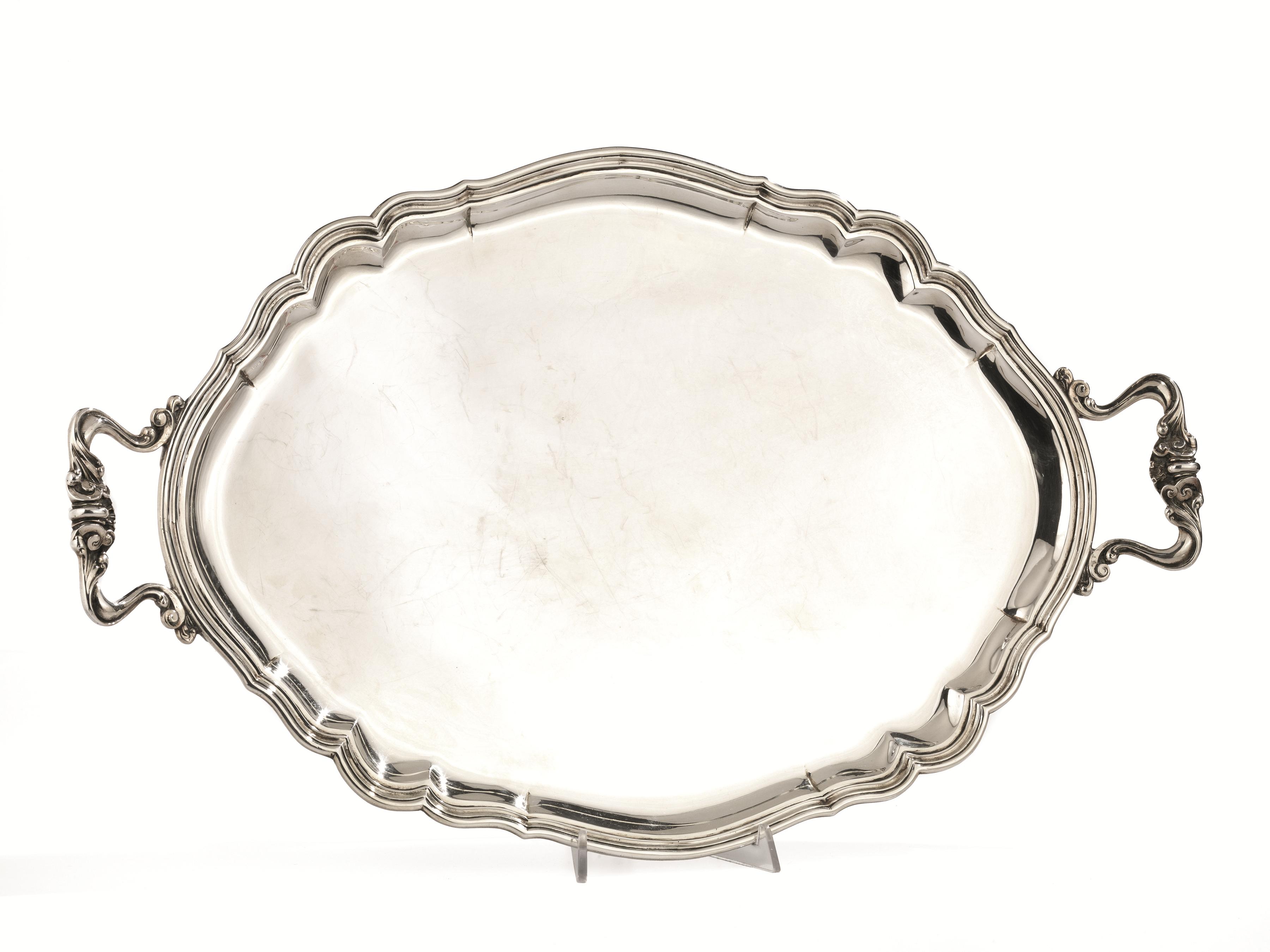 Guantiera, in argento di forma ovale sagomata, due manici a volute