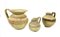 Grande brocca con orlo svasato, breve collo, corpo ovoide, fondo piatto, ansa a nastro impostata del labbro alla spalla, decorata ad archi di cerchio in bruno e paonazzo sul labbro ed a filetti e fascie alternati sul ventre; brocchetta ovoide con orlo leggermente estroflesso, corpo globulare, fondo piatto, ansa a nastro impostata dal labbro alla spalla, decorata a fasce parallele; brocca con orlo appiattito, breve collo cilindrico, corpo ovoide, piede ad anello, ansa a nastro impostata dal labbro alla spalla, decorata a fasce e a tremolo