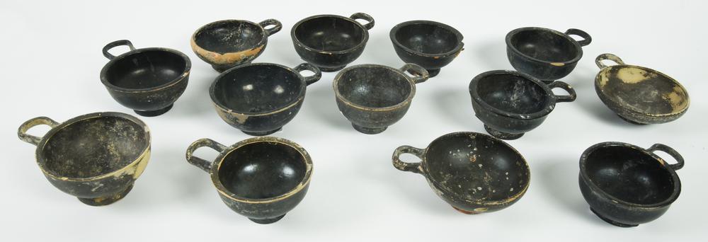 Tredici coppette monoansate con labbro appiattito, vasca semicilindrica, piede ad anello, ansa a nastro impostata orizzontalmente sull'orlo