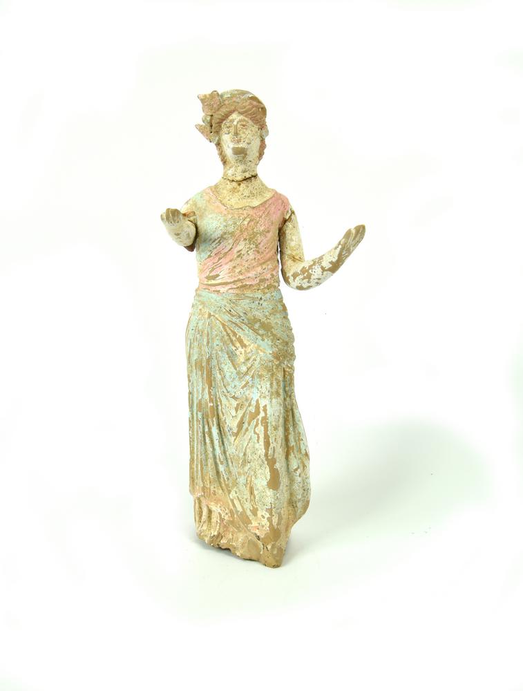 Statuetta di giovane donna coronata, la testa eretta con lo sguardo rivolto in avanti, stante sulla gamba destra arretrata, la sinistra flessa e portata in avanti; i capelli ondulati sono raccolti in una treccia sulla nuca, il volto pur nelle sue piccole dimensioni è modellato con grande verismo; la giovane indossa una lunga tunica plissettata che si apre nel movimento, con le braccia distese in avanti a sorreggere le offerte