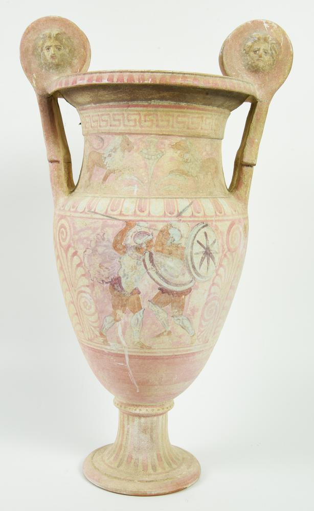 lato B) sul collo meandro sinistrorso, cui fa seguito una scena con due leoni affrontati in composizione araldica ai lati di una grande infiorescenza; sul ventre combattimento fra due guerrieri armati di elmo con alto cimiero, corazza in bronzo e schinieri che tengono ciascuno una lancia nella destra ed un grande scudo circolare nella sinistra
