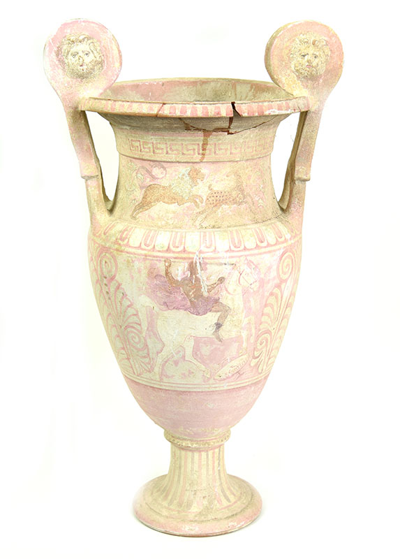 DECORAZIONE: lato A) sul collo meandro sinistrorso, cui fa seguito una scena di un leone in corsa verso sinistra che insegue un cerbiatto; sul ventre due cavalieri affiancati gradienti a sinistra con chitone corto, clamide svolazzante e alti calzari, tengono una lancia sollevata sopra la testa e le redini con l'altra mano; nel campo una grande kylix baccellata semisdraiata;