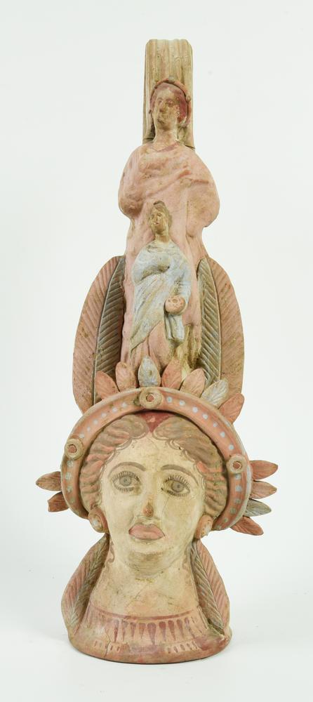 Ansa a nastro costolata sormontante, impostata verticalmente alla sommità della testa. Il corpo del vaso è elegantemente modellato a testa di giovane donna, con viso ovale, grandi occhi amigdaloidi in rilievo, naso rettilineo, zigomi lievemente pronunciati, piccola bocca carnosa e mento appuntito. I capelli sono avvolti in un sakkos a rete e formano sulla fronte ciocche ondulate con scriminatura centrale; la donna indossa una collana a due giri con pendenti ed una corona floreale di piccoli petali dipinti in bianco, rosa e celeste, sormontata da due figure femminili panneggiate poste in scala una davanti all'altra, entrambe con la testa volta a destra, capelli raccolti nell'acconciatura a melone, mantello che copre completamente la veste sottostante, braccio destro portato al petto sotto al mantello e sinistro sul fianco in quella più grande e proteso con un'offerta alimentare nell'altra