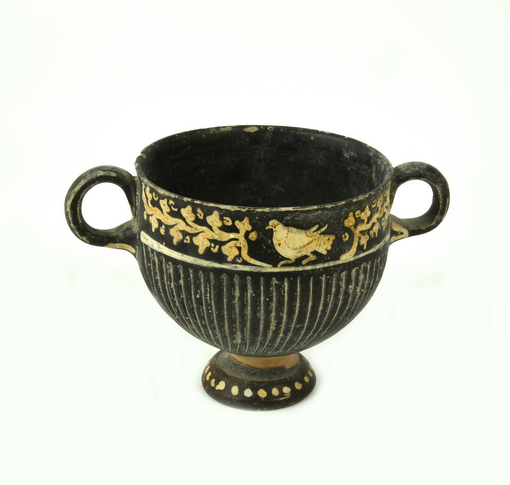 DECORAZIONE: interamente verniciato ad eccezione del collo del piede risparmiato; sotto l'orlo fascia con pampini, viticci e grappoli d'uva, centrata da una colomba stante a destra da un lato e tralcio fitomorfo dall'altro