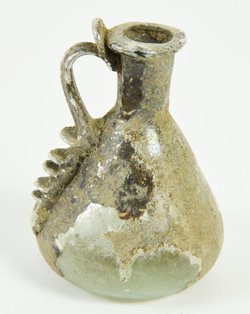 Brocchetta con orlo appiattito a tesa, collo cilindrico, corpo troncoconico, fondo concavo, ansa a nastro applicata dal collo al ventre e decorata con una serie di pinzature verticali