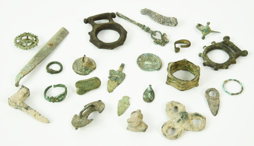 Tre passaredini in verga di bronzo, quattro anelli di varia forma in filo di bronzo, quattro pendenti lanceolati; un braccio sinistro di statuetta, quattro fibule, un piccolo coperchio conico, sei oggetti di difficile identificazione (23)