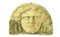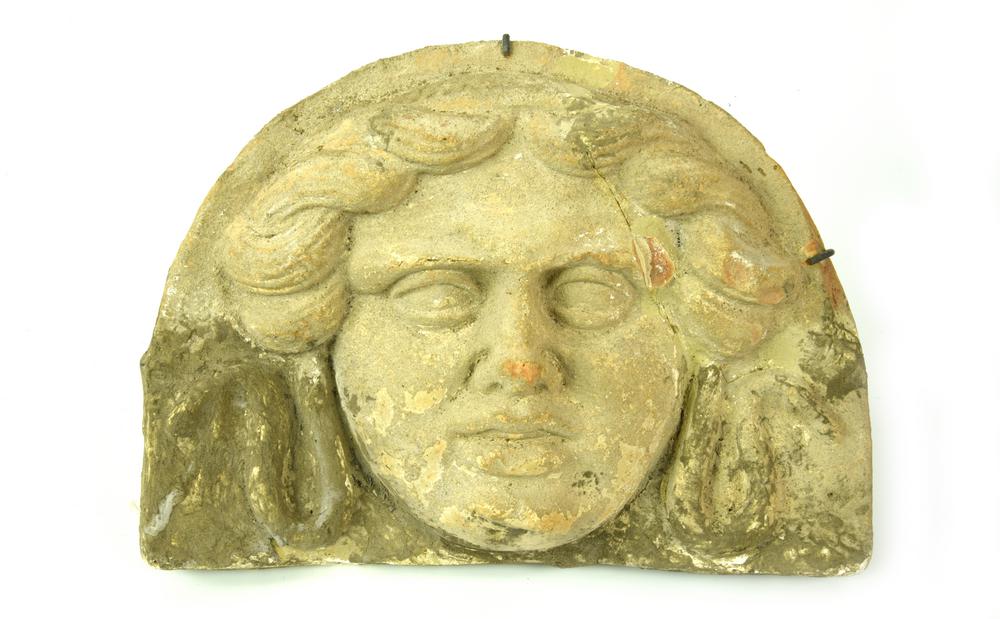 Antefissa ad arco con testa di Gorgone di tipo calmo, con folti capelli ondulati, grandi occhi sgranati, fronte aggrottata, zigomi rilevati, bocca semichiusa, piccolo mento infossato, due serpentelli ai lati delle guance.