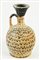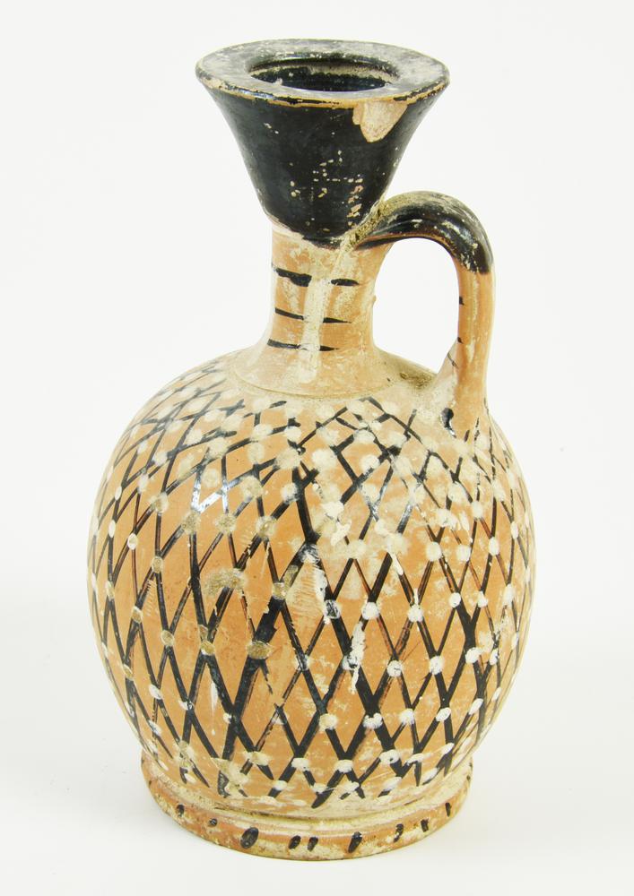 DECORAZIONE: bocchello ed ansa verniciati, ventre interamente decorato con motivo a reticolo diagonale di linee in nero centrate da un punto in bianco nelle intersezioni
