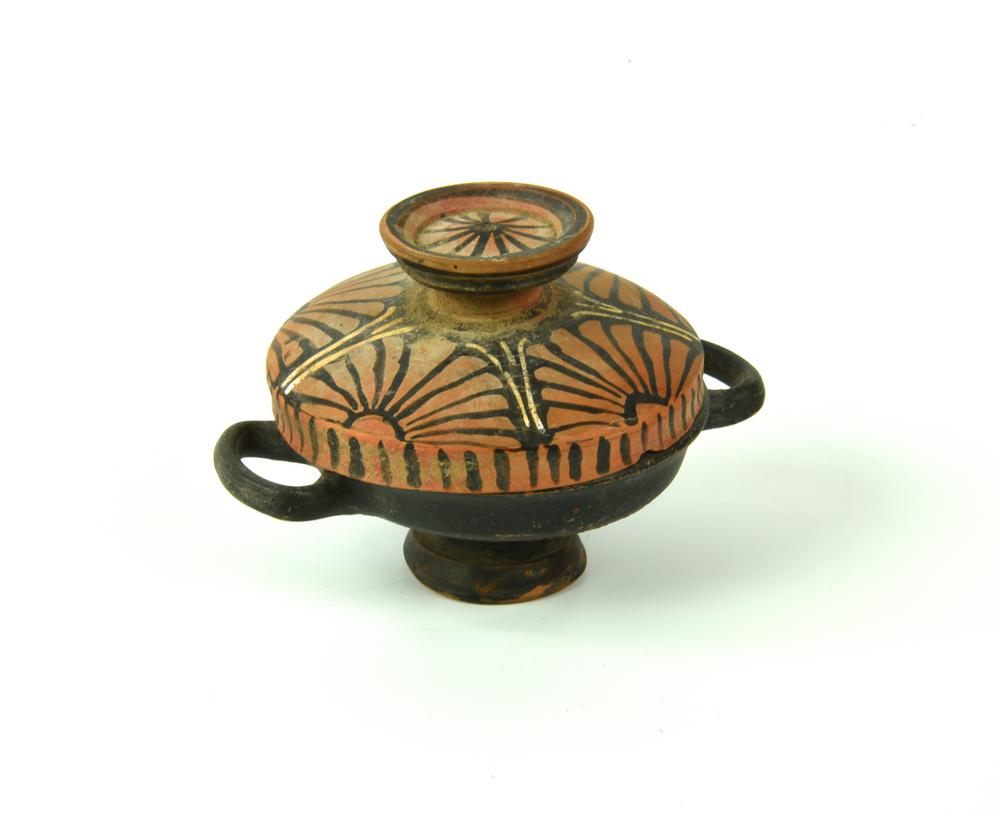 DECORAZIONE: coperchio, sulla faccia superiore del pomello, trattini radiali, delimitati da una fascia; sulla spalla quattro palmette aperte a ventaglio separate da linee in bianco orlo decorato con falsa baccellatura. Coppa: interamente verniciata di nero