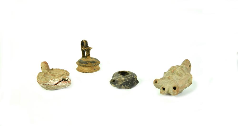 Una lucerna monolicne a vernice nera, con serbatoio globulare; una lucerna punica trilicne modellata a volto umano; una lucerna bizantina con serbatoio perlinato un'epichysis a vernice nera (4)