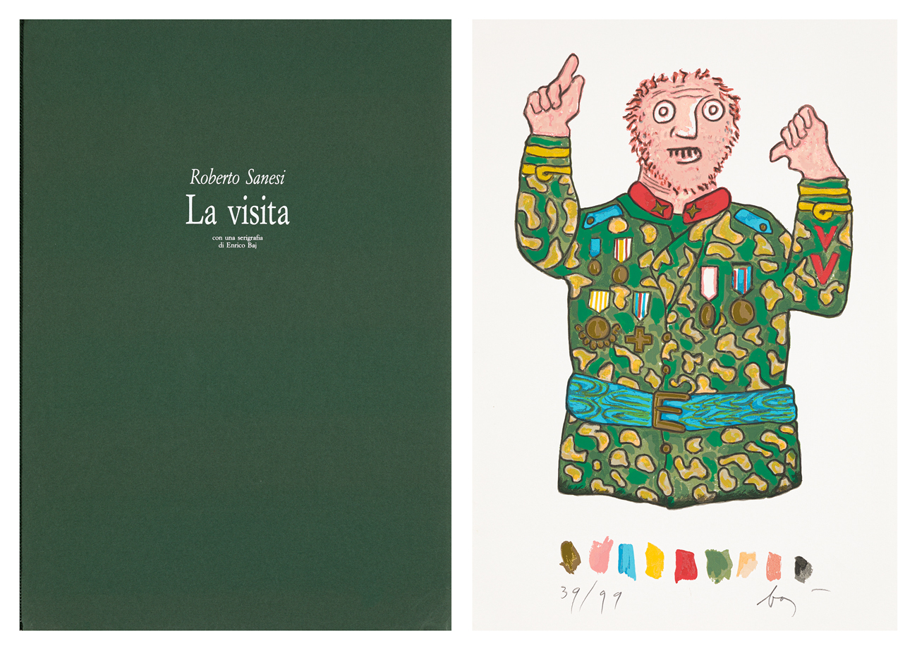 Cartella contenente testo di presentazione di Roberto Sanesi e una serigrafia polimaterica di Enrico Baj recante firma e numerazione (Esemplare 39/99) a matita al fronte