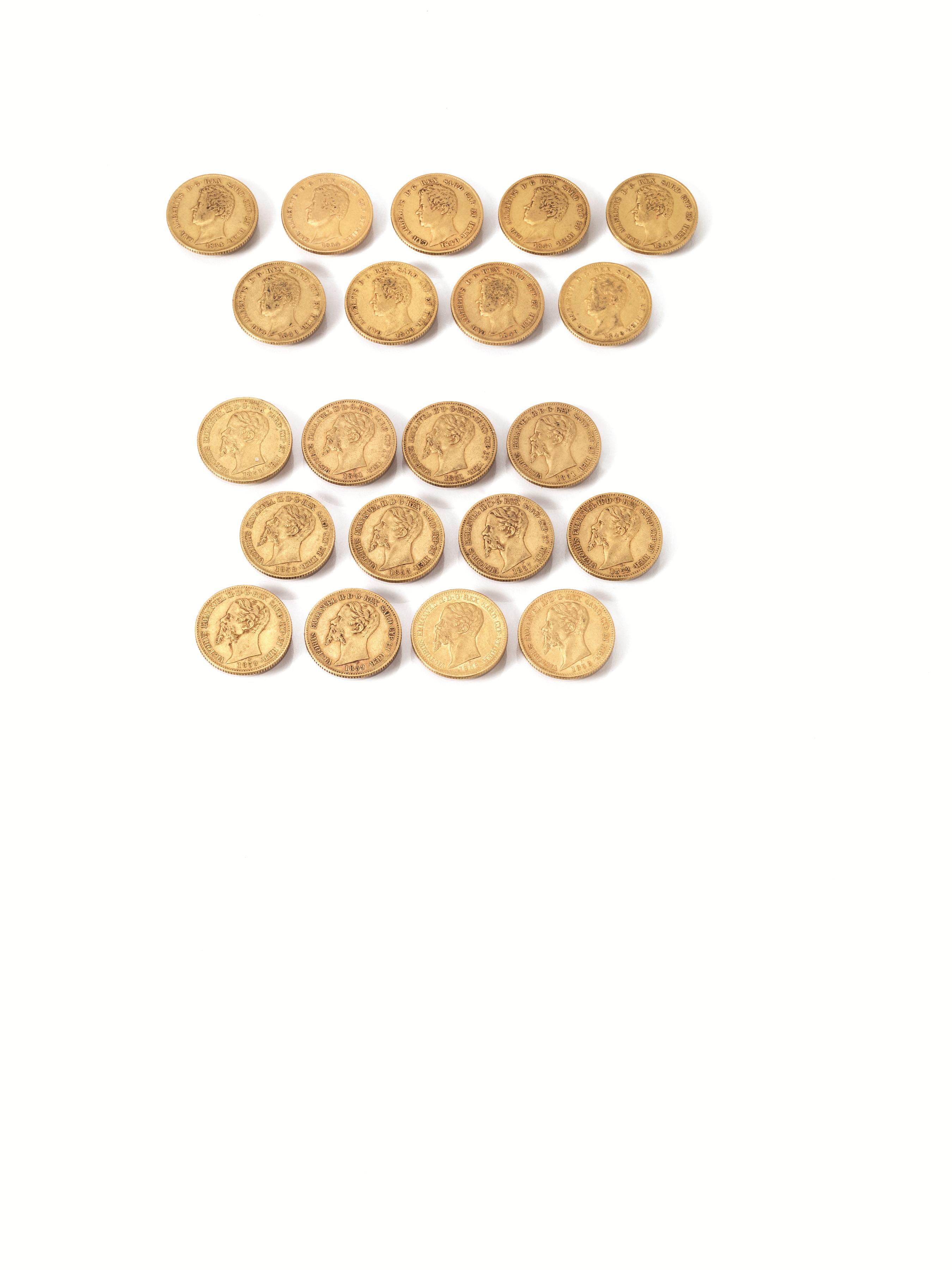 Ventuno monete in oro Nove monete Carlo Alberto re di Piemonte e Sardegna, 20...