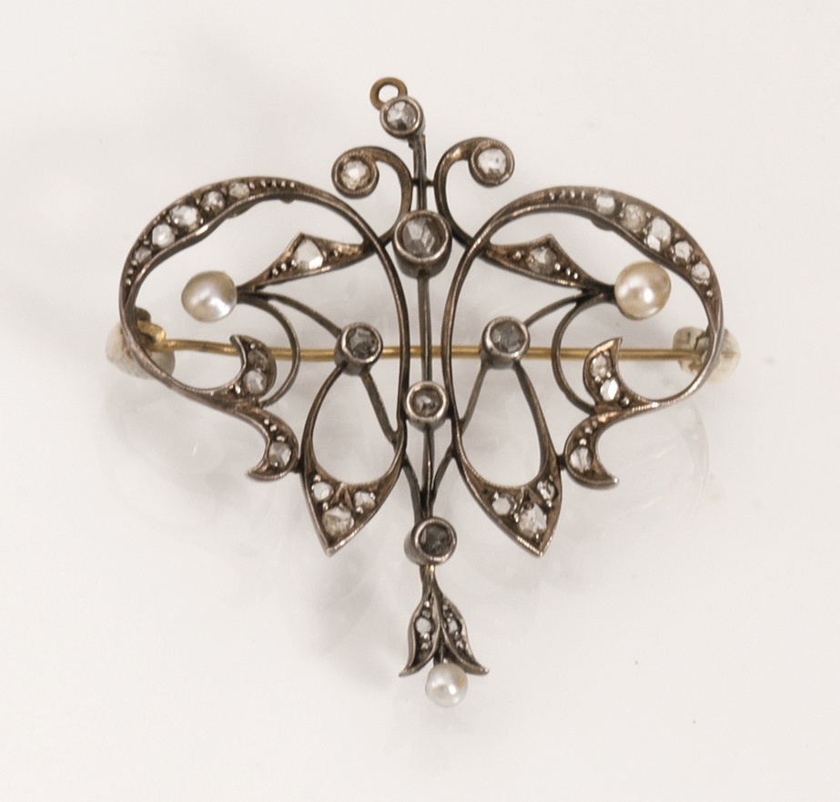 Spilla, periodo Liberty, in argento, oro giallo e rose di diamante