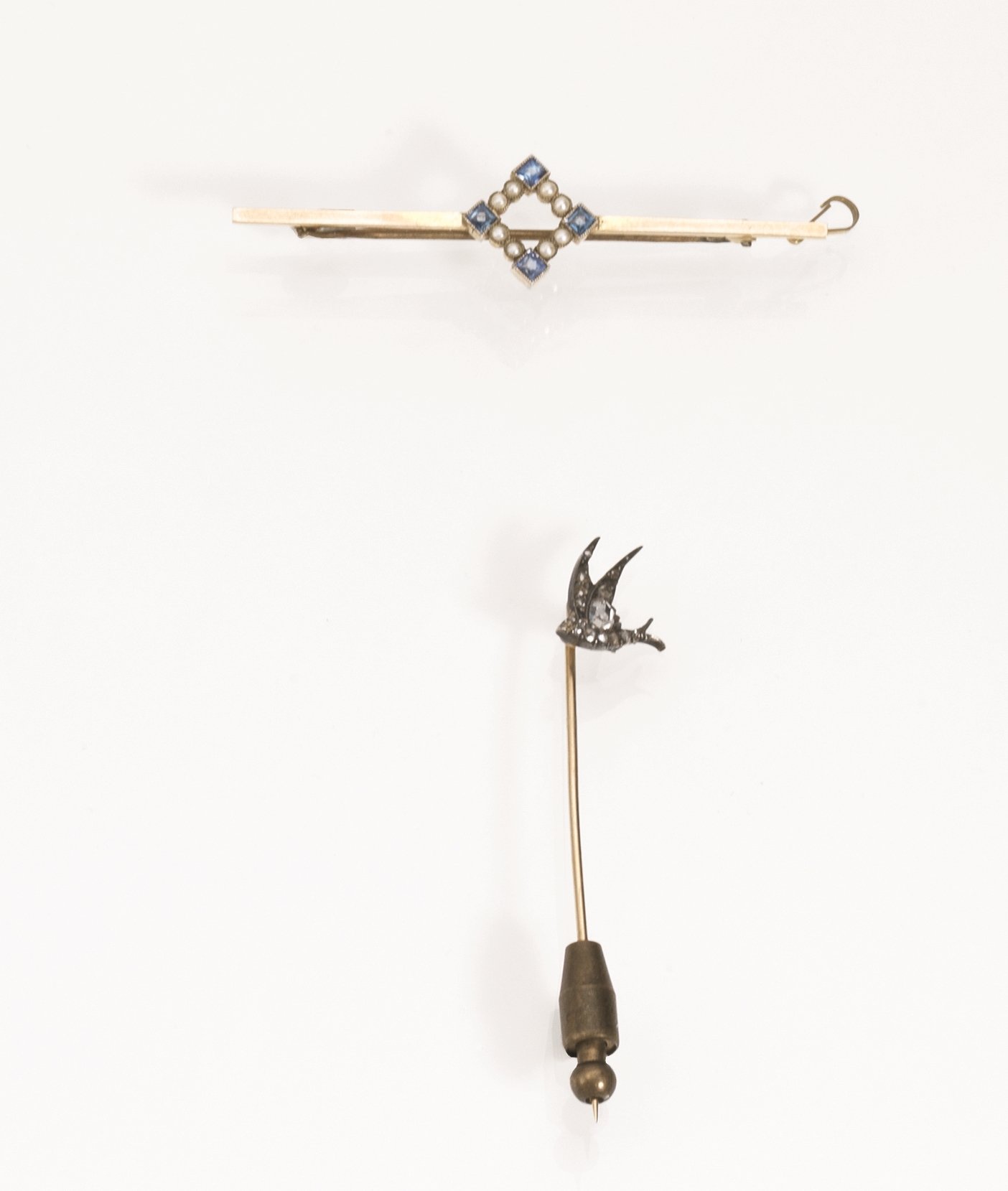 rispettivamente realizzate a barretta in oro centrata da un piccolo rombo in microperle e zaffiri ed a spillone decorato all'estremità da una piccola rondine in rose di diamanti, g 4