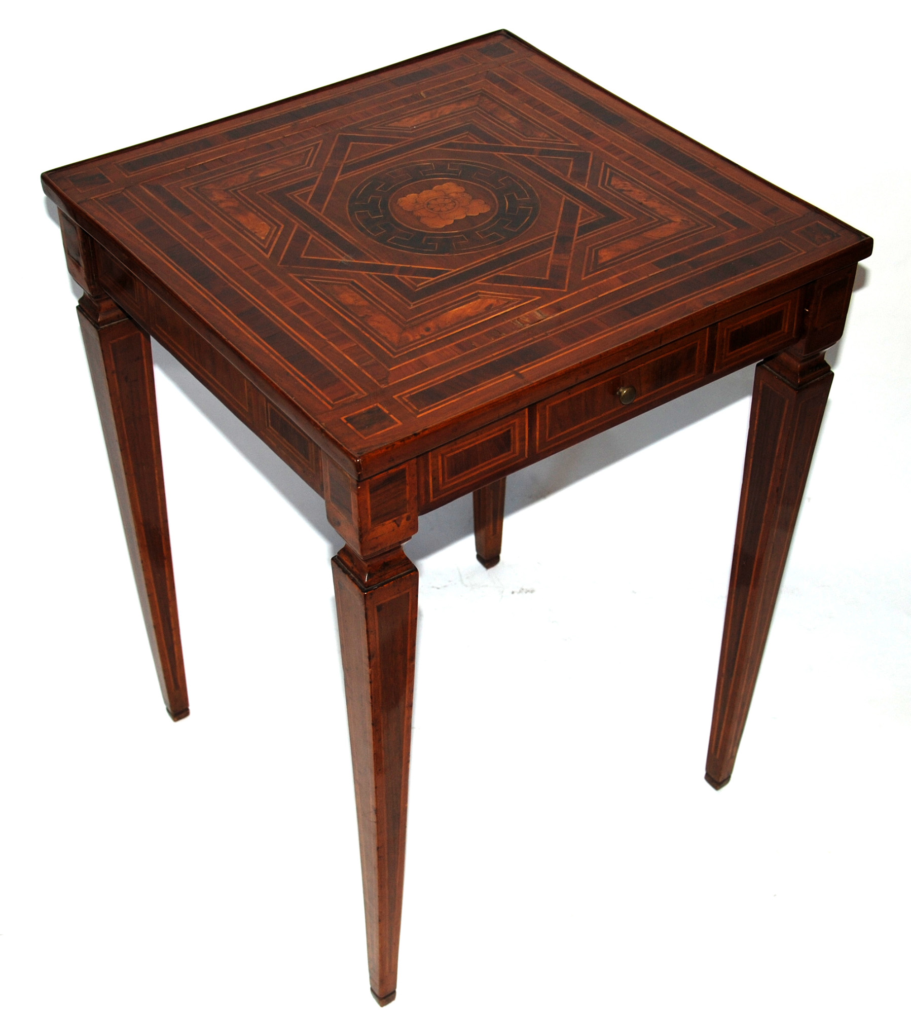 tavolino intarsiato in legni vari a motivi geometrici Rolo epoca Luigi XVI fine sec XVIII
