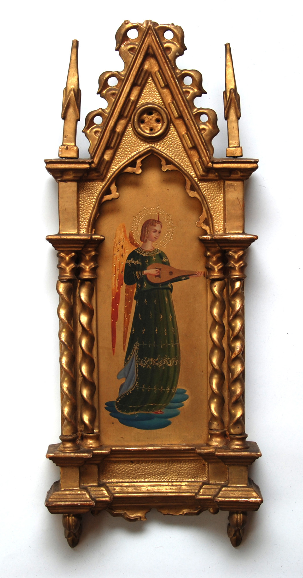 olio su tavola fondo oro raff.soggetto religioso in cornice dorata sec.XIX