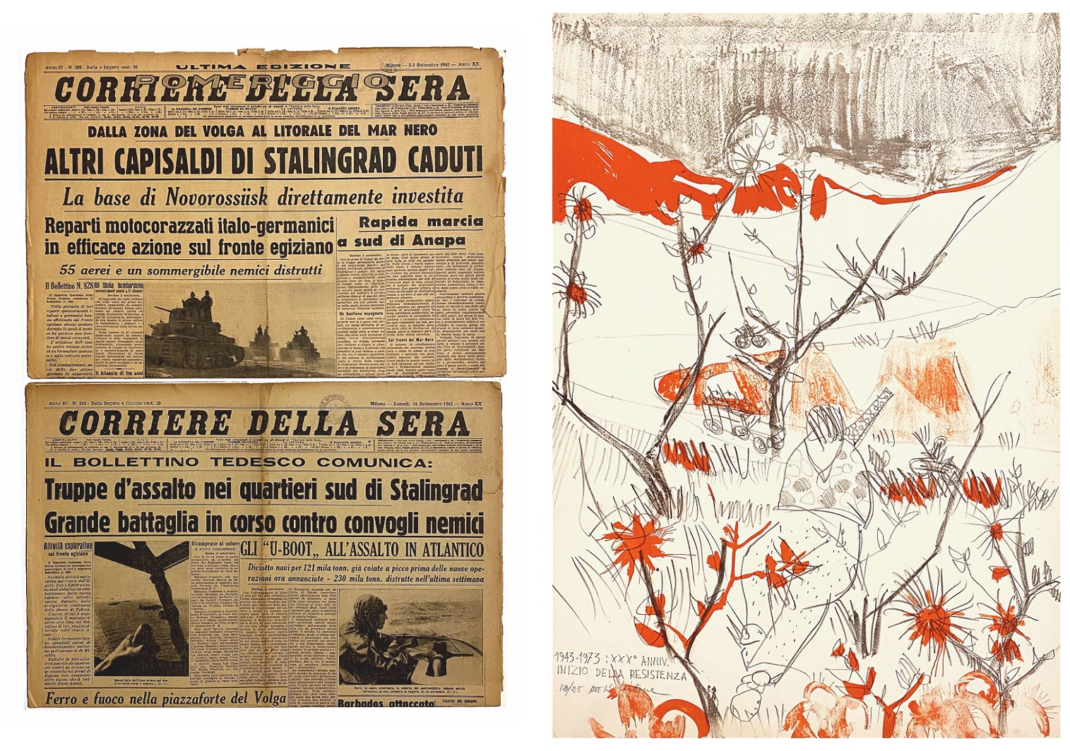 Immagine a sx: Corriere della Sera, 1942, cm 60x43.Immagine a dx: Autore anonimo; 1943-1973: XXX° anniv. inizio della resistenza, 1973, litografia a colori su carta es. 12/25, cm 70x49; Titolo, tiratura e firma (non decifrata) in basso a sx. Provenienza: Avanguardie milanesi 1960-1980, dalla collezione privata di Franco Passoni (MI).