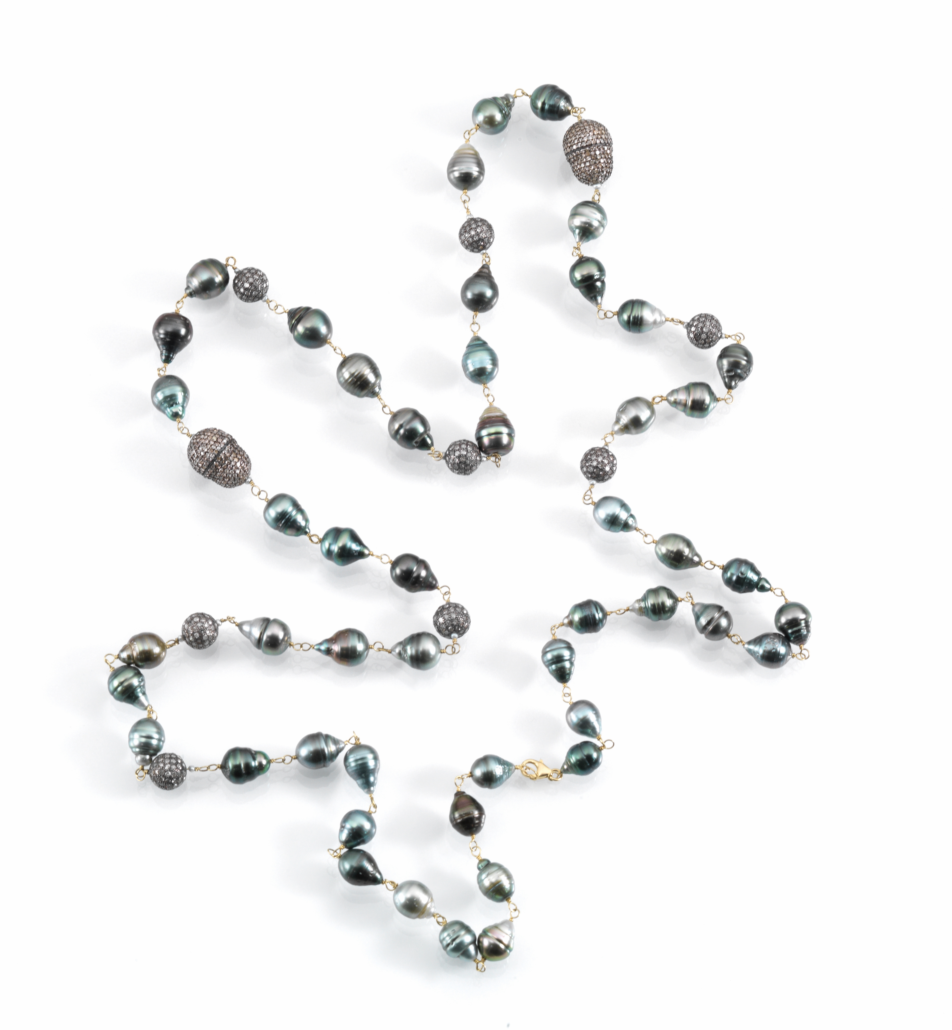 Lunga collana in oro giallo, argento, perle Tahiti grigie e diamanti