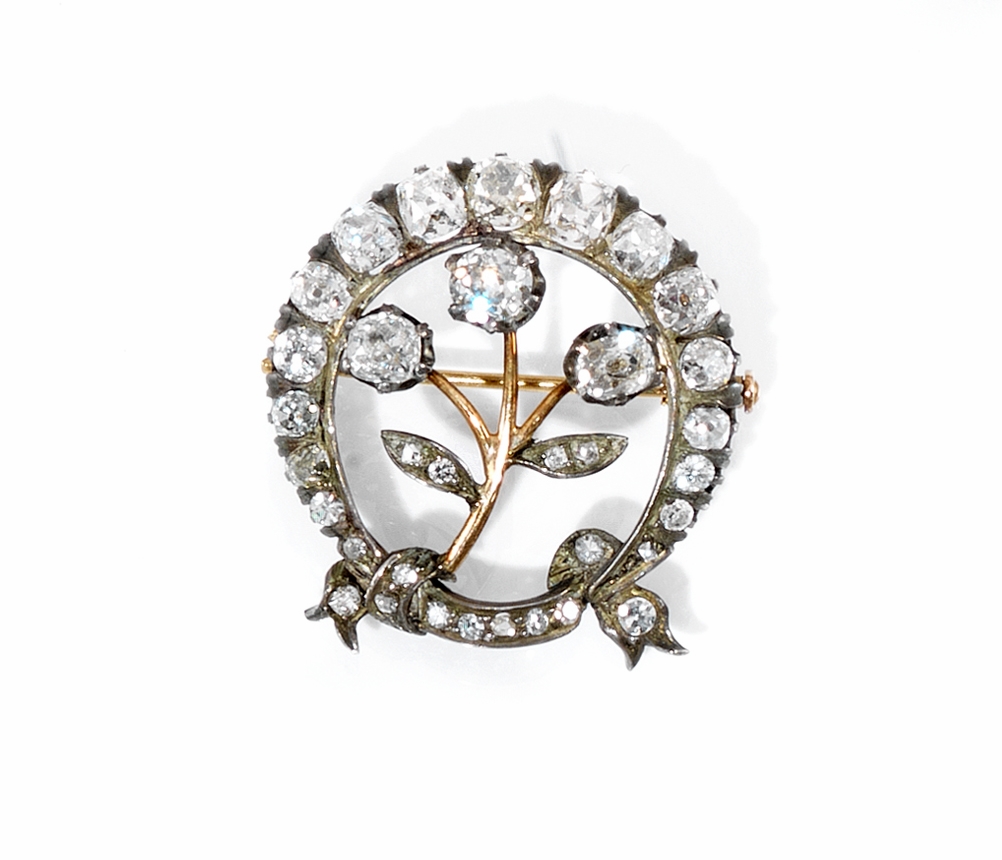 Spilla, fine sec. XIX, in argento, oro rosa e diamanti