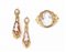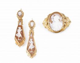 gli orecchini realizzati ciascuno con un cammeo ovale raffigurante mascherone incorniciato da volute vegetali a cui è sospeso un cammeo di forma romboidale raffigurante fanciulla danzante montato entro motivi a nastri e volute; la spilla formata da un cammeo ovale raffigurante profilo di guerriero, profilo femminile e putto, con montatura analoga, corredato di astuccio (3)