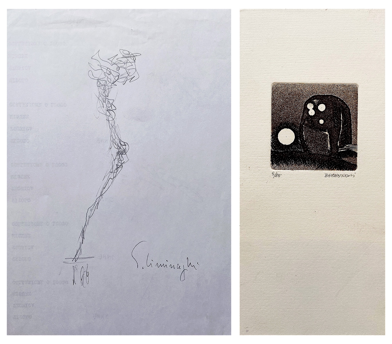 Immagine a sx: Ciminaghi Virgilio, Senza titolo, anno non dichiarato, china su carta, cm 30x20, firma in basso a dx. Immagine a dx: Becheroni Elvio, Senza titolo, anno non dichiarato, incisione acquatinta es. 5/85, cm 3x30, tiratura in basso a sx e firma in basso a dx. Provenienza: Avanguardie milanesi 1960-1980, dalla collezione privata di Franco Passoni (MI).