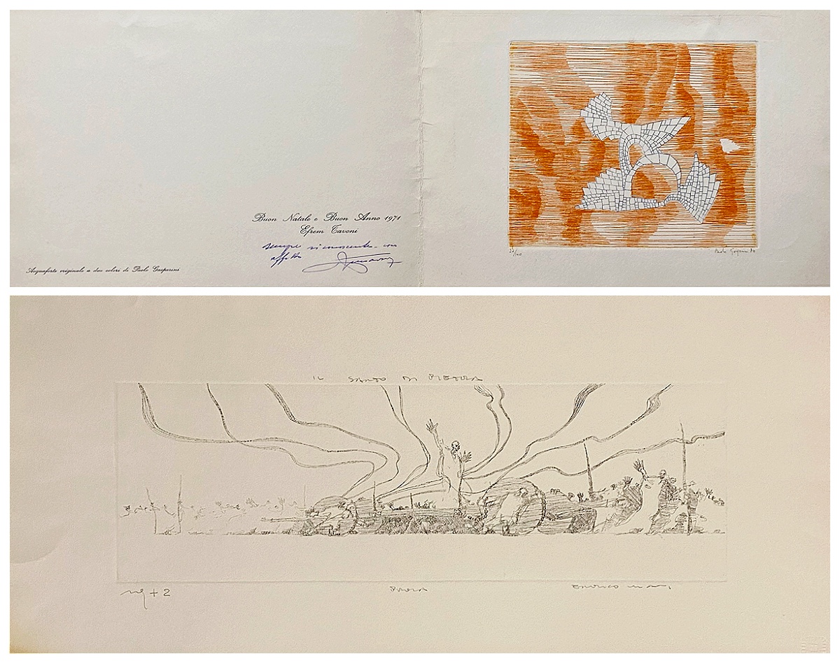 Immagine in alto: Paolo Gasperini, Senza titolo, 1971, incisione acquaforte originale a due colori, cm 17x25, firma in basso a sx.