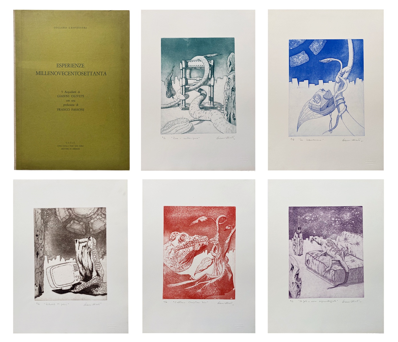 Cartella con cinque acquaforti a colori su carta originali es. a/e con una prefazione di Franco Passoni, tiratura, titolo e firma in basso.