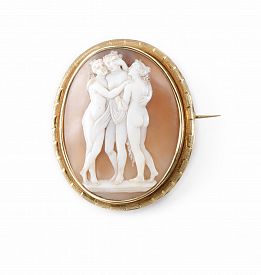 realizzata con un cammeo ovale raffigurante le Tre Grazie montato entro cornice in oro giallo satinato ed inciso