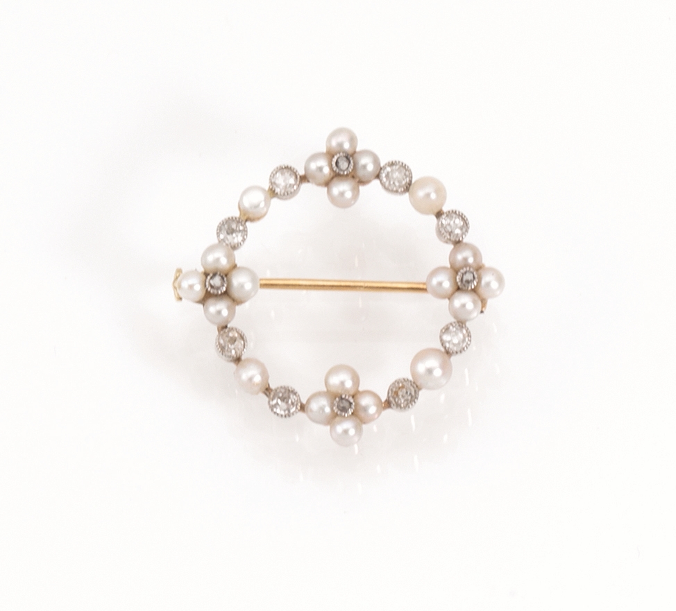 Spilla, fine sec. XIX, in oro giallo, argento microperle e diamanti