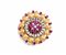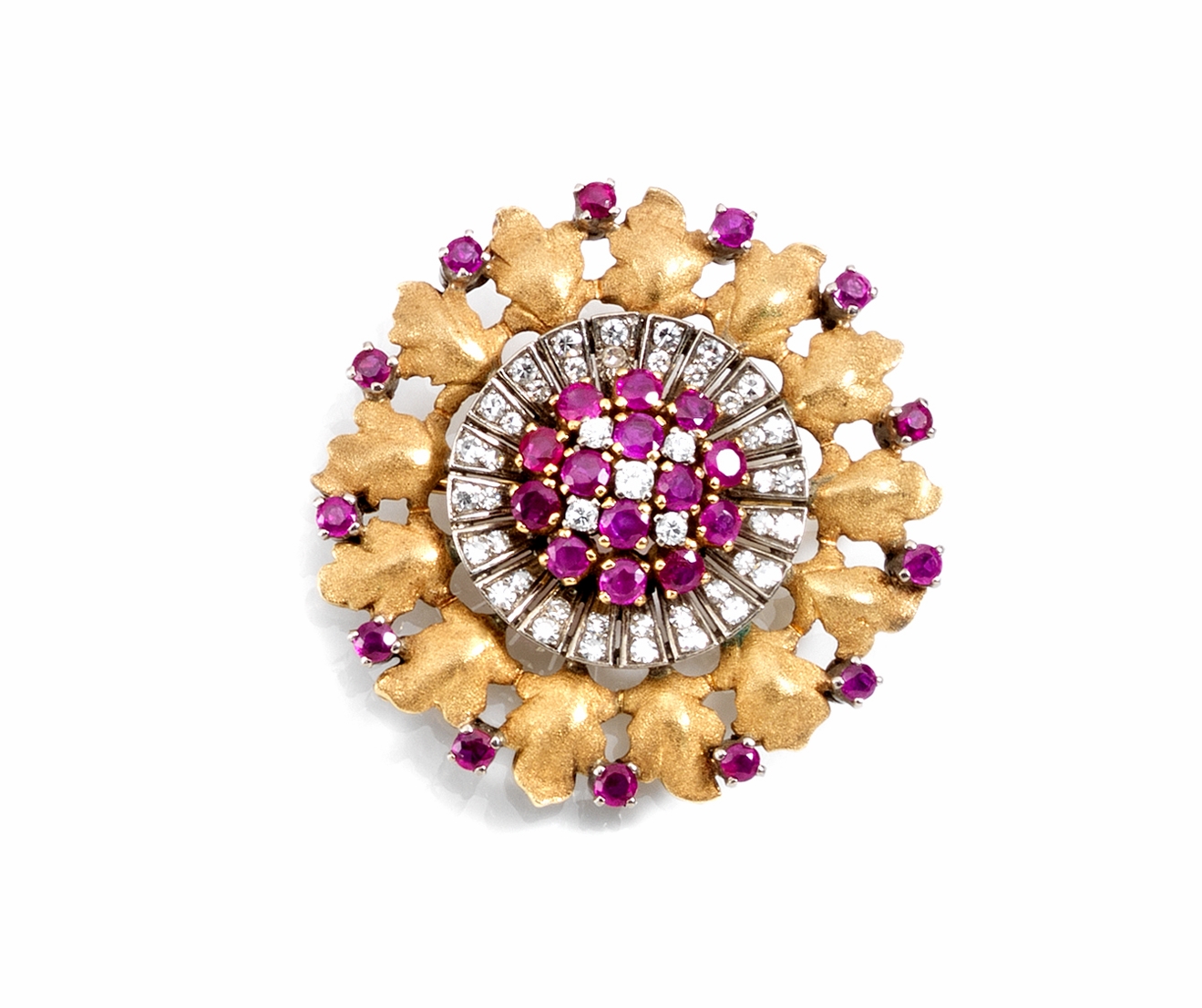 Spilla in oro giallo, oro bianco, rubini e diamantidi forma circolare,...