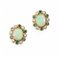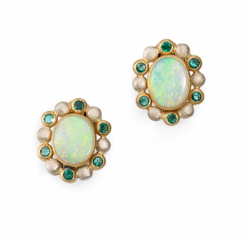 ciascuno realizzato con un opale montato entro una cornice ovale formata da sferette in oro bianco satinato e piccoli smeraldi montati entro castoni in oro giallo, g 11, non firmati, entro astuccio Mario Buccellati