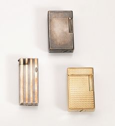 rispettivamente: due Dunhill in argento inciso a guillochè, completi di astuccio; un Dupont in argento e oro lavorato a righe, ed altro in oro giallo inciso a motivi geometrici, non funzionanti (4)
