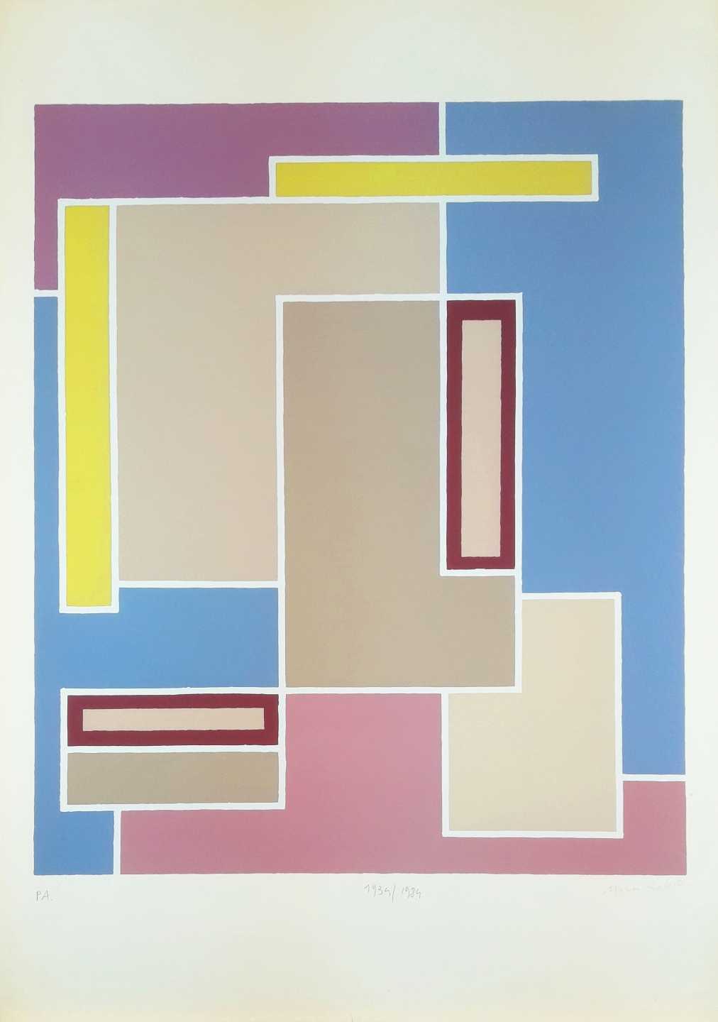 RADICE MARIO Como 1898-Milano 1987 “Composizione C F” serigrafia a 11 colori su cartone fabriano cm 69x49 del 1934/84. Firmata a matita sul fronte in basso a destra, datata al centro, dicitura P.A. a sinistra e numerazione dei colori.