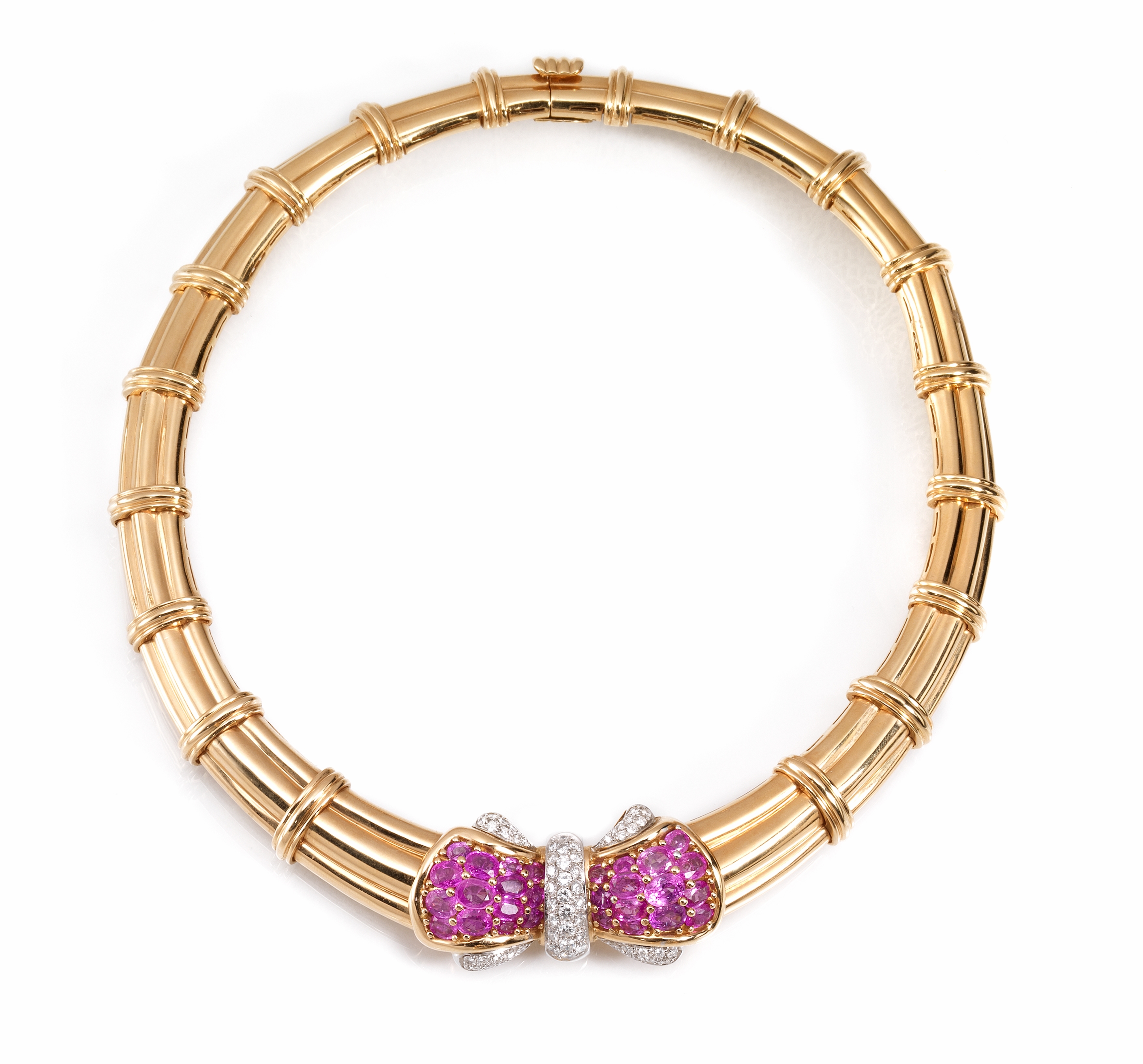 gradazione unito ad effetto bambù, al centro elemento a fiocco decorato in pavè di brillanti per ct 2 circa e zaffiri rosa per ct 20 circa, g 144