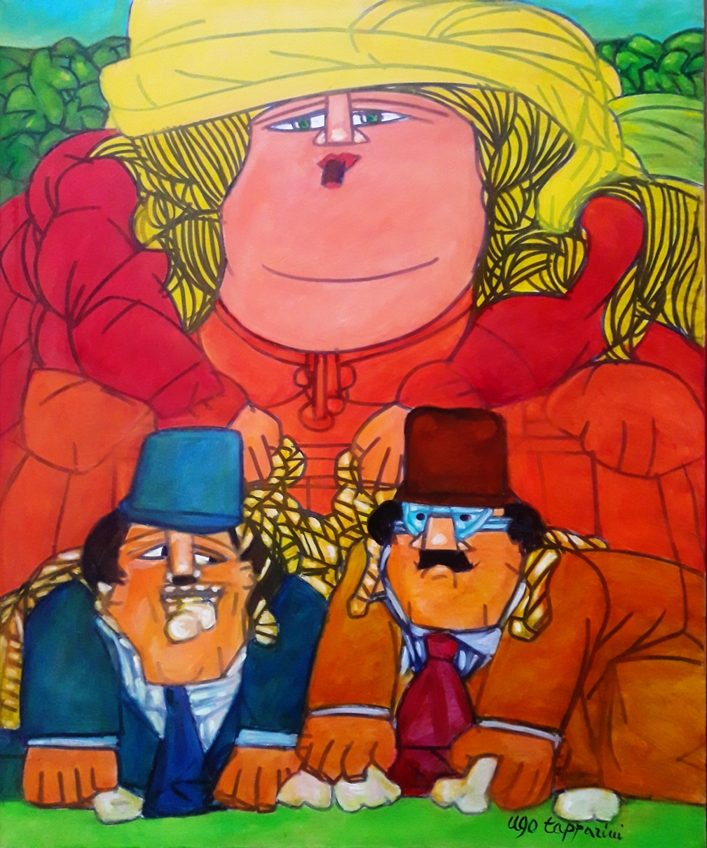 TAPPARINI UGO Lecce 1933 - 2016 “Mariti al guinzaglio” olio su tela cm.100x120, firmato sul fronte in basso a destra. Sul retro titolo e firma per autentica. Pubblicato sul catalogo “Una mente disordinata” edito durante la mostra al Castello Carlo V di Lecce. Autentica su foto a cura della galleria Scarauzza con catalogo a corredo e foto dell’opera esposta.