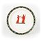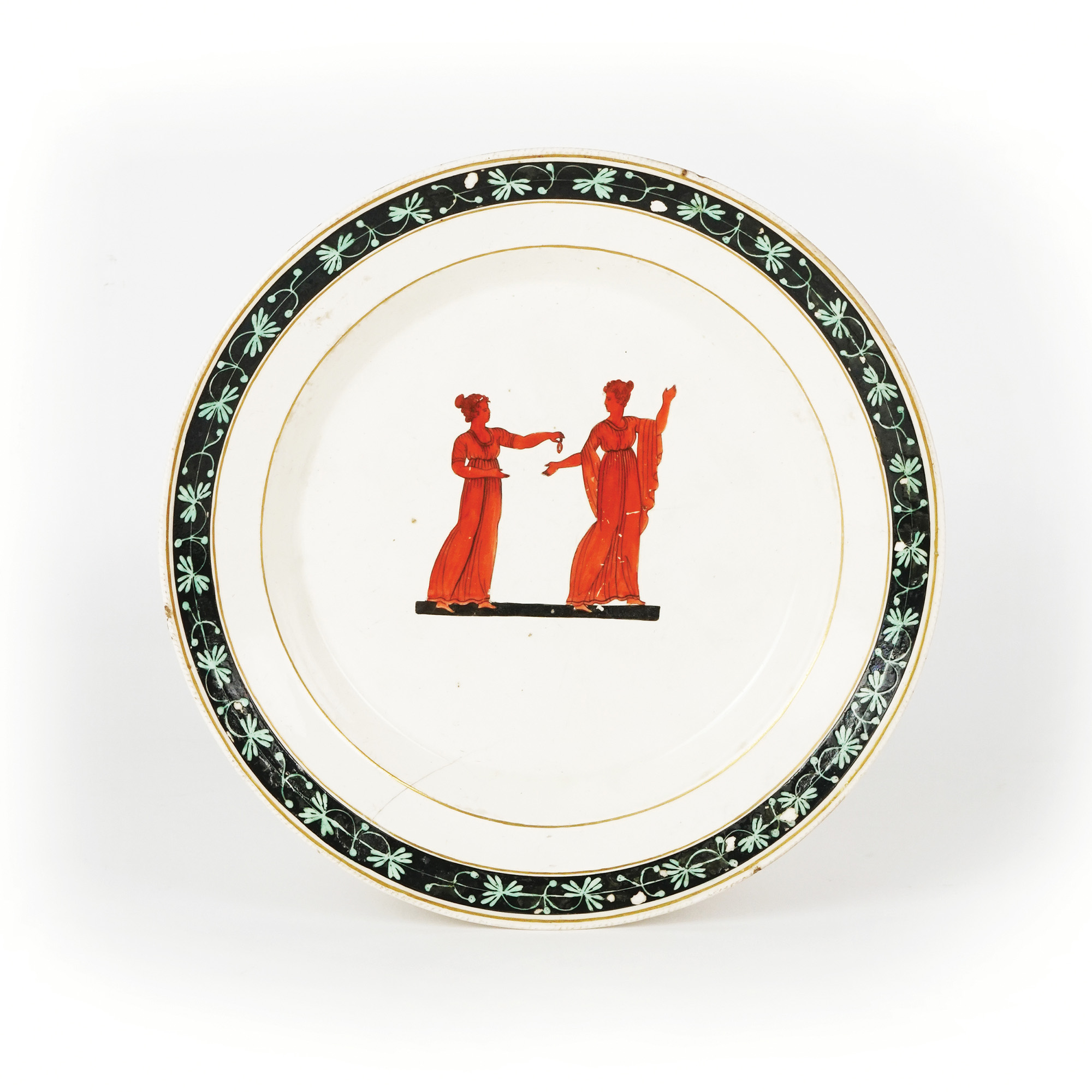 Piatto in terraglia bianca e policroma, dipinto nel cavetto a figure pompeiane, sulla tesa a motivi fogliati stilizzati.
