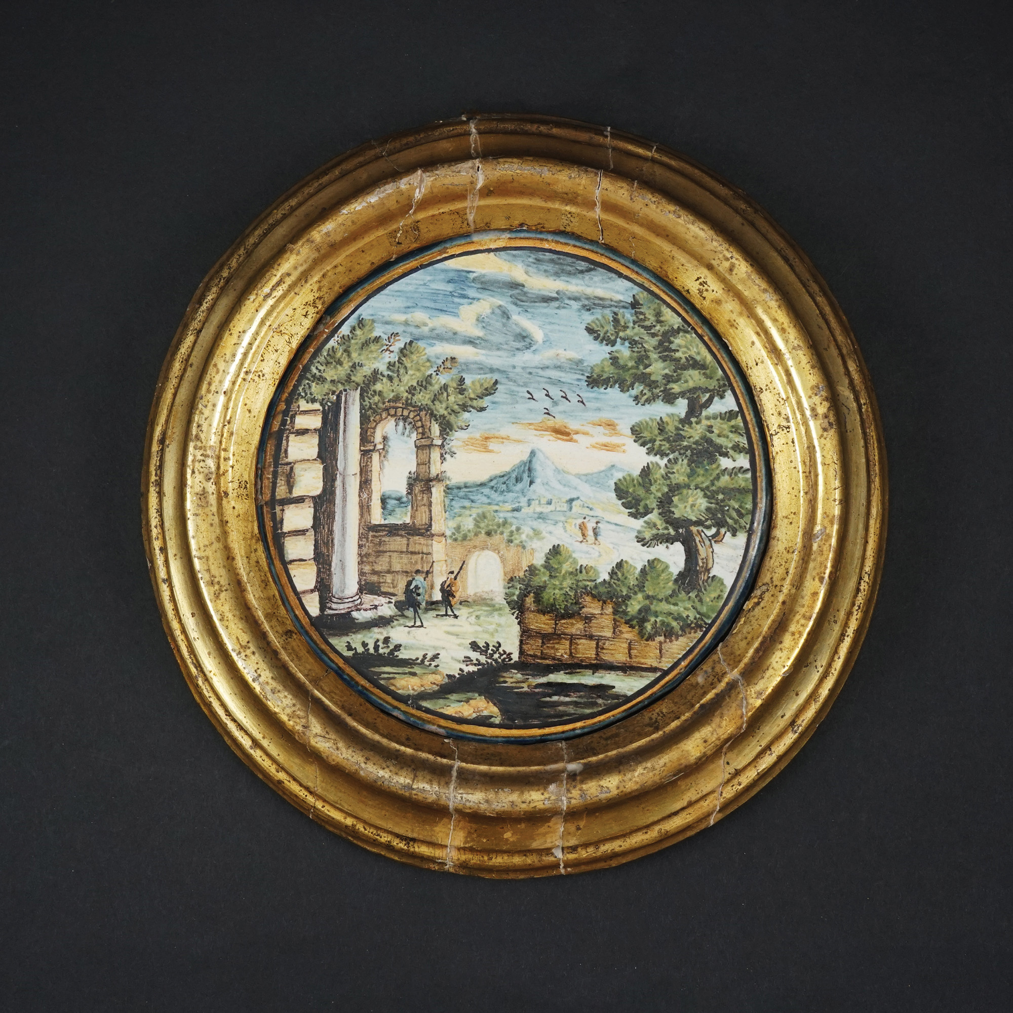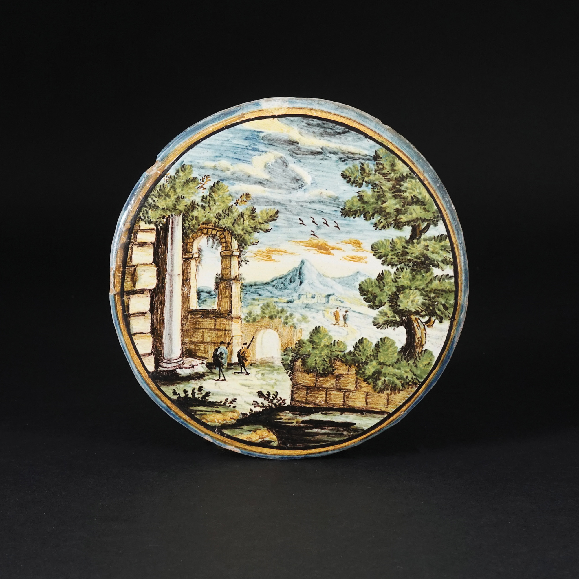 Lotto 16 | Formella circolare in maiolica policroma dipinta a raffigurare un paesaggio...