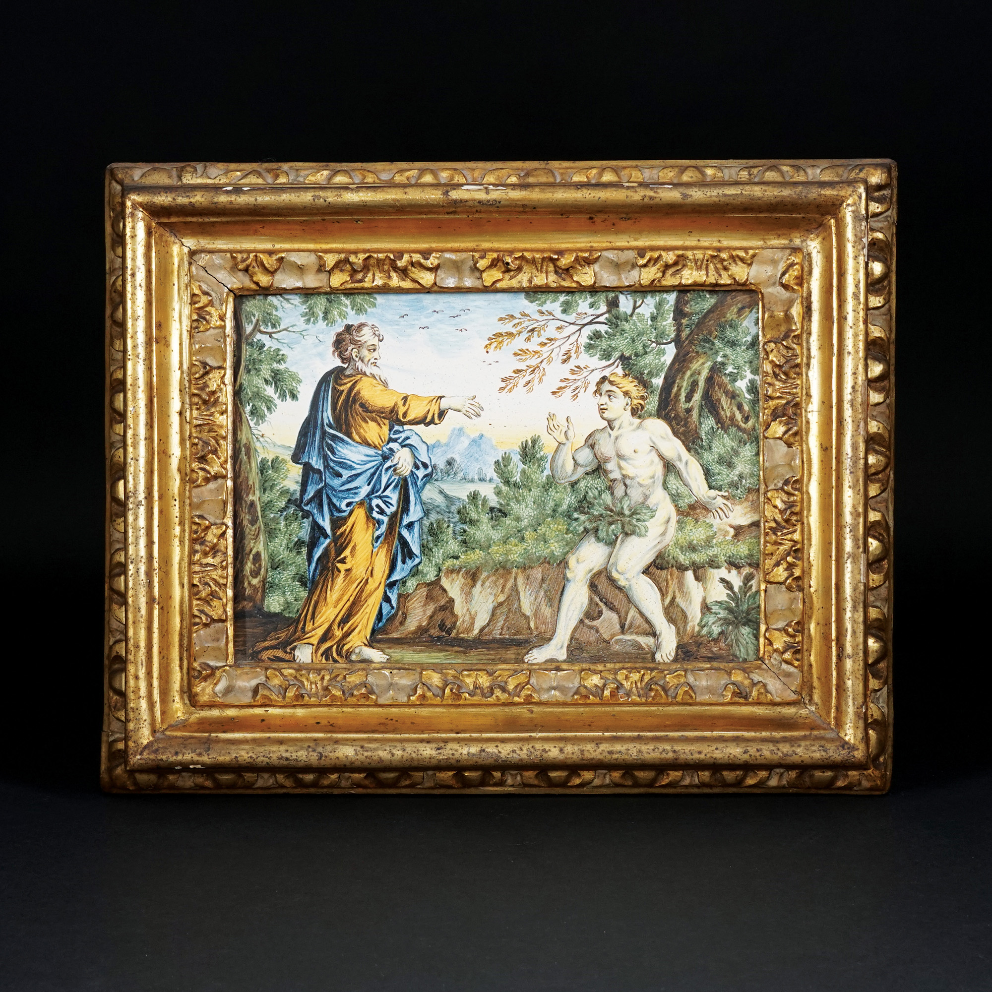 Formella rettangolare in maiolica policroma finemente dipinta a raffigurare la Creazione di Adamo.