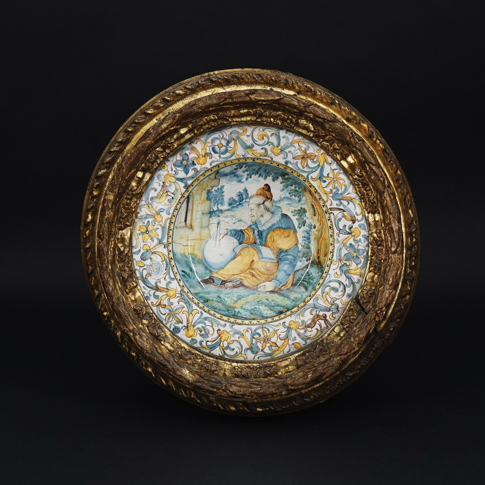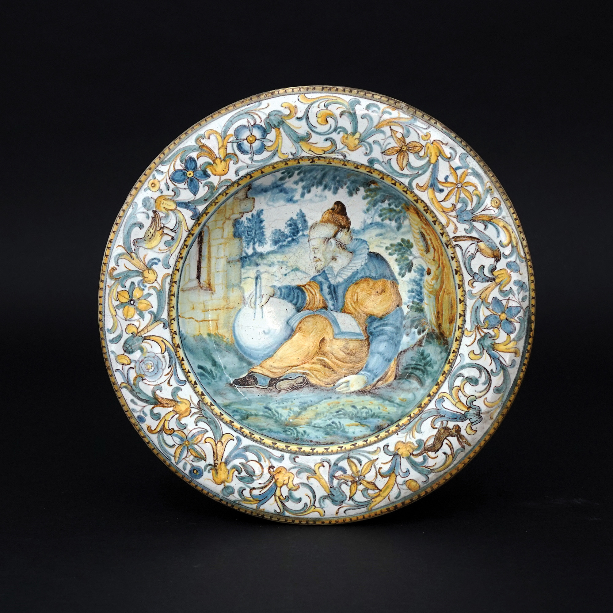 Piatto in maiolica bianca e policroma, dipinta nei toni del giallo, arancione, azzurro e verde a raffigurare nel cavetto un astronomo seduto sotto un albero; la tesa è decorata da fitti girali fogliati e corolle floreali; in cornice di legno scolpito e dorato.