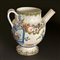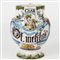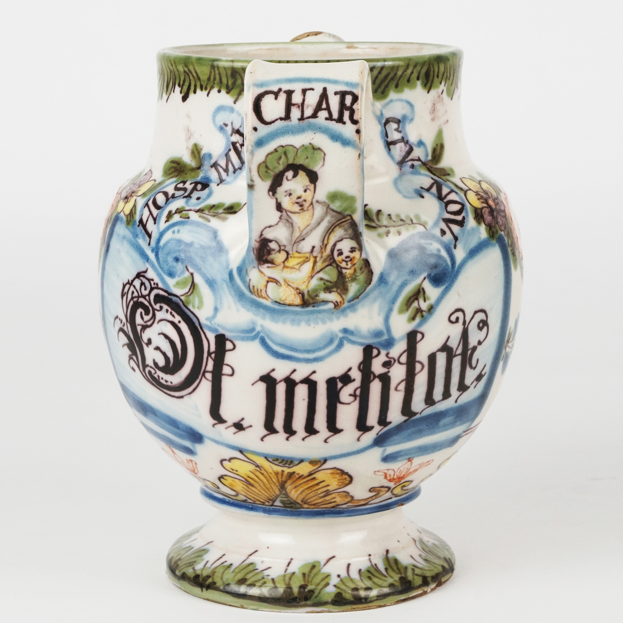 Versatoio in maiolica bianca e policroma, dipinto a festoni floreali. In prossimità della presa ricurva un cartiglio con iscrizione farmaceutica in caratteri gotici: Ol. melilot. idealmente trattenuto da una sorta di nastro iscritto: HOSP. MAI. CHAR. CIV. NOV.; piede circolare.