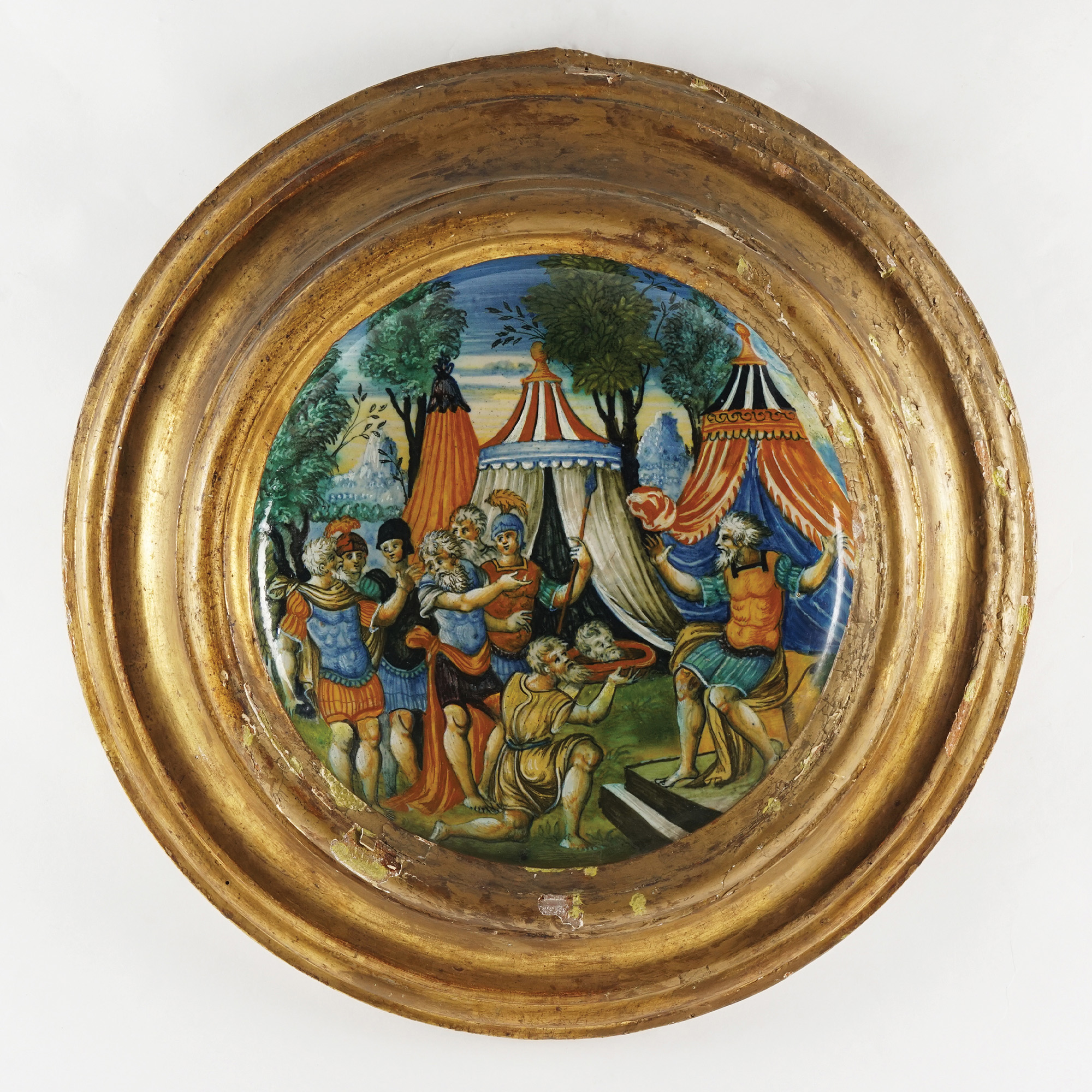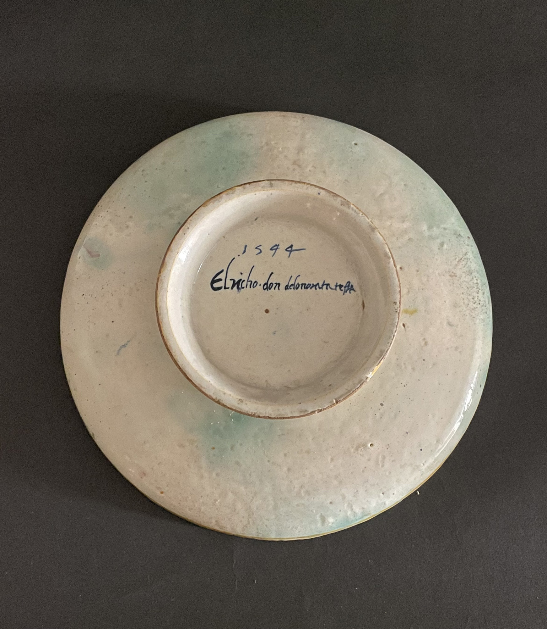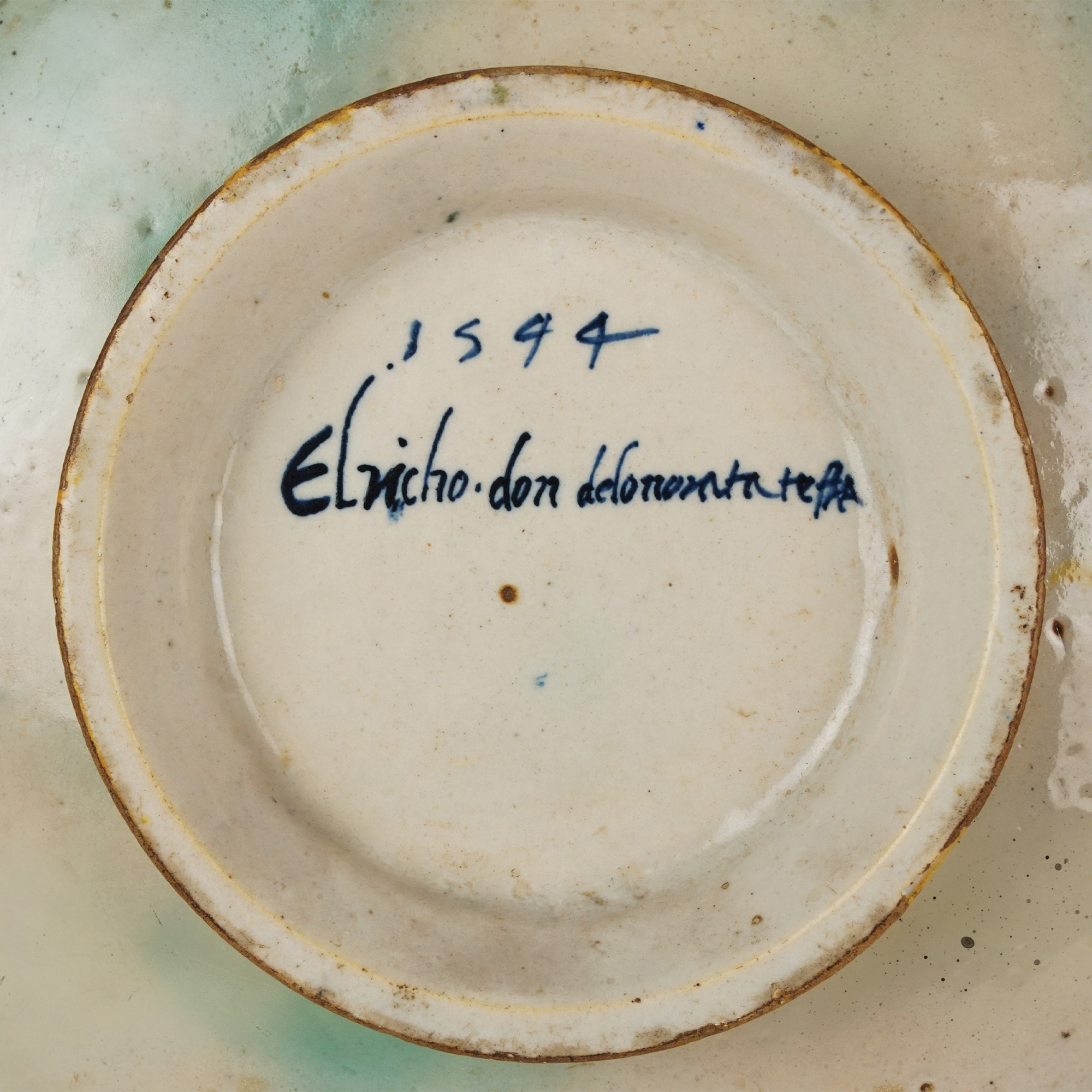 Pesaro, bottega dei dalle Gabicce, 1544, a tergo la legenda in blu: 1544/ Elricho. don delonorata testa, h. cm. 2; d. cm. 25,5 (restauri e mancanza al bordo)