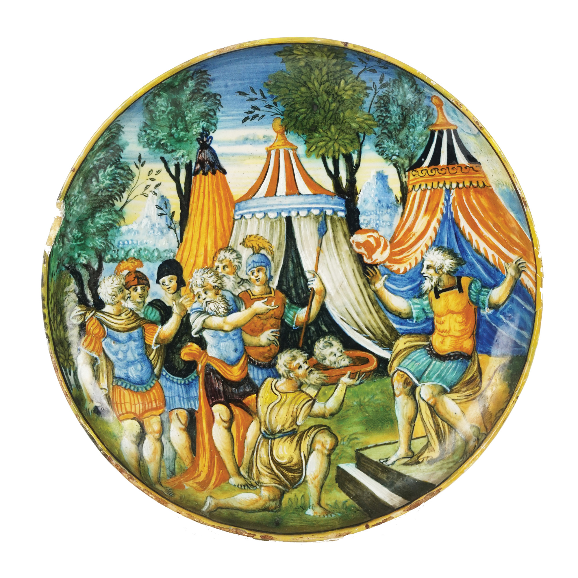 Alzata in maiolica dipinta nei toni predominanti dell'ocra, azzurro e verde a raffigurare La testa di Pompeo presentata a Cesare.