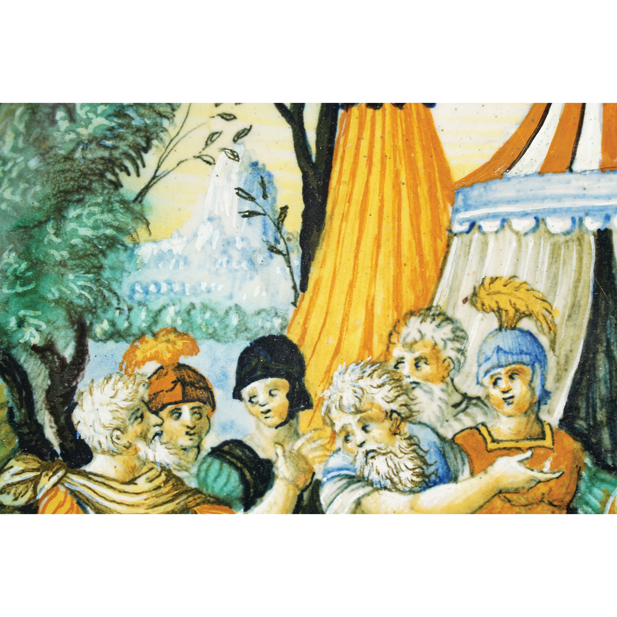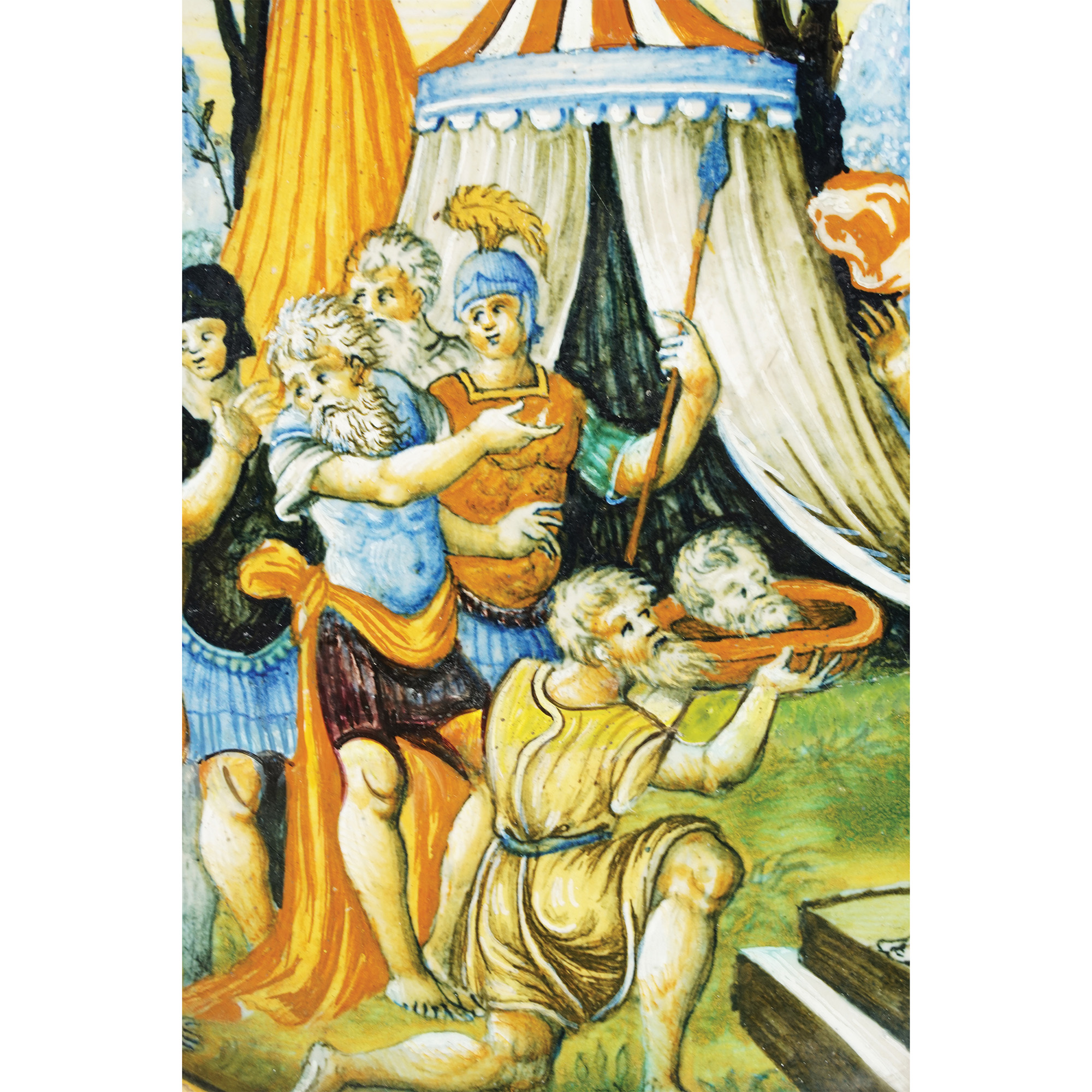 La maiolica illustra un episodio di storia romana, ovvero la presentazione della testa di Pompeo a Cesare. Dopo la disfatta di Farsalo, arrivato di fronte alle coste egiziane, Pompeo inviò un messaggio al giovane sovrano Tolomeo XIII, che era impegnato a Pelusio in una guerra contro la sorella e moglie Cleopatra VII. Questi decretarono che Pompeo andava eliminato per evitare che la sua presenza in Egitto giustificasse eventuali ingerenze di Roma negli affari interni del Paese. Pompeo fu attirato in trappola dai messi di Tolomeo, che gli offrirono di trasportarlo a terra su una piccola imbarcazione. Il generale riconobbe sulla barca un vecchio compagno d’arme, il tribuno Lucio Settimio, e accettò fiducioso. Ma quando ormai la costa era vicina, Achilla, prefetto di Tolomeo, e Settimio lo pugnalarono. Dopo aver assistito a quell’evento tra l’incredulità e la paura, i suoi familiari e amici levarono le àncore e fuggirono senza vendicarlo. Fu Giulio Cesare ad assumersi questa incombenza: sconvolto dalla morte e dalla decapitazione del rivale, fece giustiziare i responsabili del tradimento.