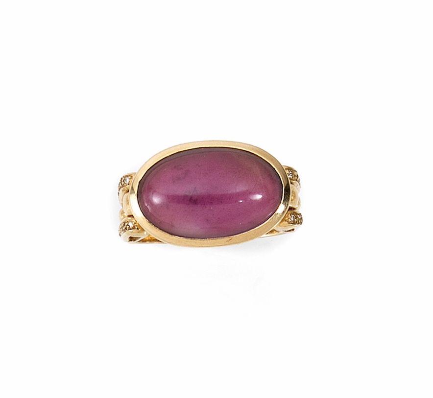 Anello in oro giallo, ametista e diamantial centro un'ametista ovale cabochon...