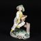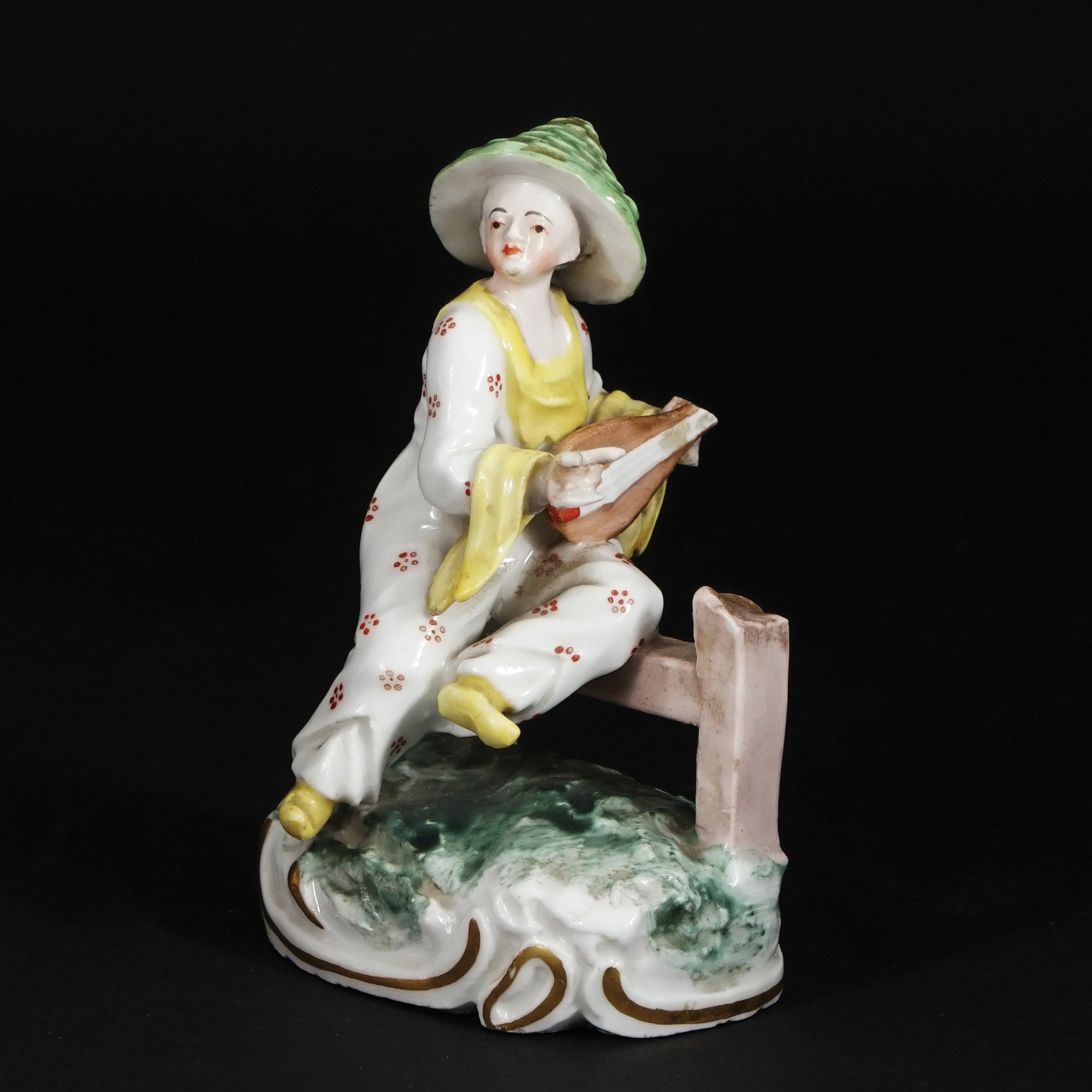 Scultura in porcellana policroma raffigurante un suonatore asiatico seduto.